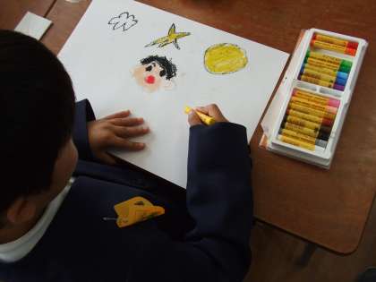 子どもたちは、目キラキラさせてクレパスで必死に絵を描いていました。