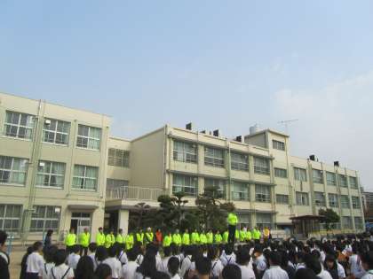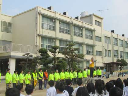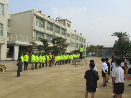 今日は、児童朝会の前に、「子ども安全見守り隊」の方々との対面式を行いました。