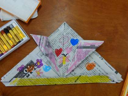 大きい新聞紙にちょっと苦戦の子どもたち。