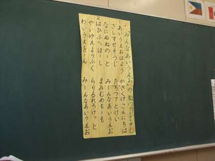 授業のはじめにひらがなに慣れていない児童のときは歌を歌っています。これは、きらきらぼしの替え歌で「みんなあいうえお」です。