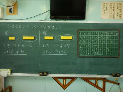 1年生は算数で「足し算」の学習をしています。