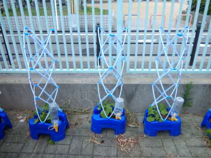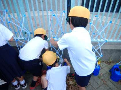 もっとアサガオが大きくなるように、みんなで支柱を立てました。