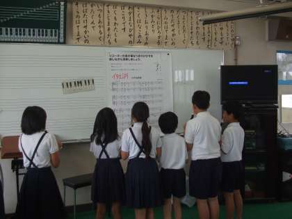 イ短調の曲を学習しました。上のパートと下のパートに分かれてリコーダーの重なり合う響きを感じとりながら練習しました。ソ#の難しい指使いもありますがいっしょうけんめいに取り組んでいます!!