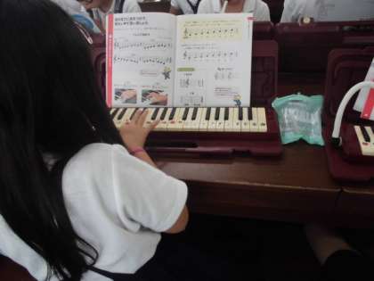 音楽の授業では、鍵盤ハーモニカを使い、スムーズに曲を演奏できるように、指またぎの練習をしています。とても上手に演奏できています。