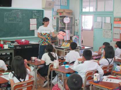 歯の模型のターボー君と一緒に、前歯や奥歯の磨き方やいつもの歯磨きでは、磨き残しがあることを楽しく勉強することができました。