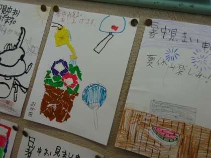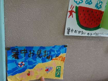 夏らしい絵や言葉を使って、工夫しながら個性豊かな暑中見舞いを仕上げていました。