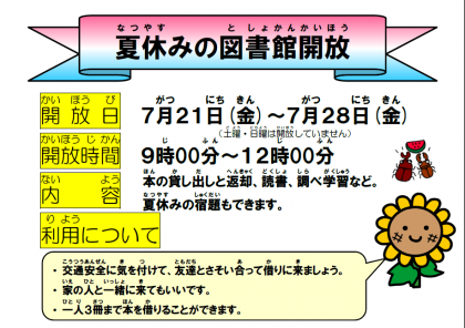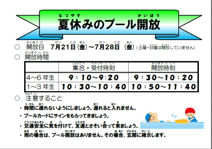 今年も図書館開放、プール開放があります。