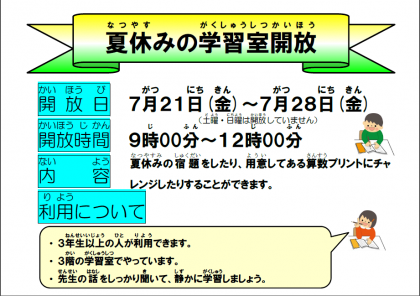 21日〜28日まで夏休みの開放があります