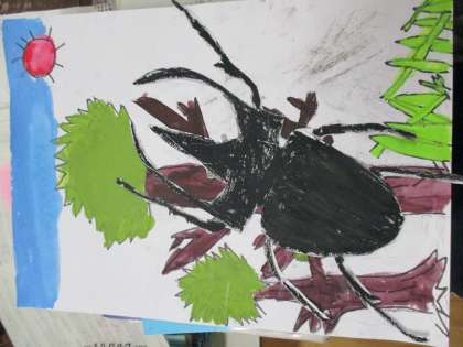 昆虫の絵が完成しました。子どもたちは、昆虫の体のつくりや形を意識しながら、作品作りに取り組みました。何度もお手本の写真と見比べ、細かいところまで似せようと頑張っていました。