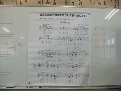 秋の赤いものといえば…と質問をすると(夕焼け、もみじ、彼岸花、夕日など)たくさんの赤いものを発表してくれ、「まっかな秋」を二部合唱しています!!