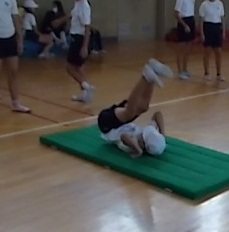 足はできるだけ大きく開き、膝を伸ばした美しい開脚前転、開脚後転になるよう頑張って練習しています。
