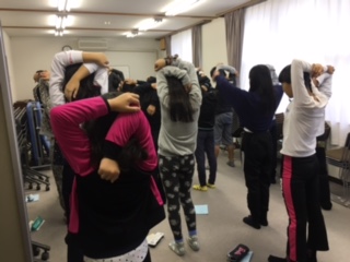 外はあいにくの雨で、朝のつどいは宿舎の中で行いました!
