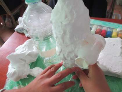 紙粘土とペットボトルなどを使い、お城作りを行いました。粘土に色を付けたり、ビーズを張り付けたりしながら、素敵な作品に仕上げていました。作品展を楽しみにしておいてください。