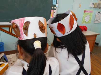 学校に帰ってからは落ち葉やどんぐりを使って、かんむりを作りました。