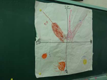 午前10時、正午、午後2時で一日3回調べました。太陽の動き方と影の動き方、その関係について気づき発表することができました。