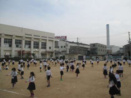 みんなで縄跳び運動に取り組んでいる様子です。体を強くしたり、瞬発力を鍛えるために子どもたちは毎時間懸命に縄跳びに取り組んでいます。その中で、新しい技にもチャレンジできています。