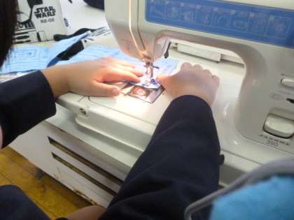 家庭科の学習ではミシンの使い方について学習しています。上糸・下糸のかけ方やミシンの動かし方などを練習しています。練習布を使って、まっすぐに縫ったり、返し縫いをしたりと一生懸命に取り組んでいます。エプロンもミシンで作る予定なので、2学期中に完成できるようにがんばります。