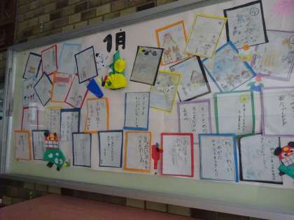 1月、出来島小学校のエントランスの掲示板は3年生の掲示です。