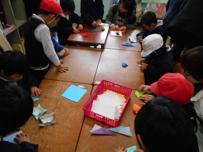 一年生が昔遊びのお店を開き、保護者の皆さんを招待しました。