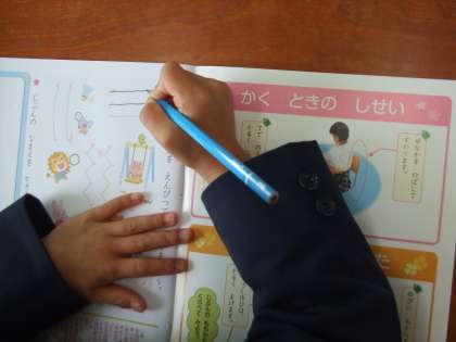 そして、鉛筆の持ち方を練習し、ひらがなワークに線をひきました。