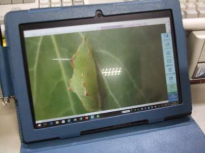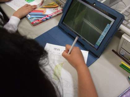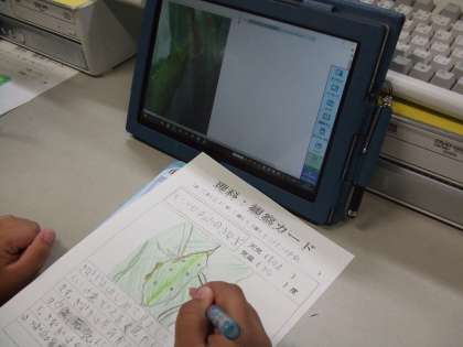 今日は、チョウのサナギの体の色や模様だけじゃなく、どんなところに糸を張るのかなど、タブレットを使って詳しく調べたよ。タブレットを使うと、見たい角度から色々と見ることが出来て、新しい発見もあったね。またタブレットを使って学習しようね。