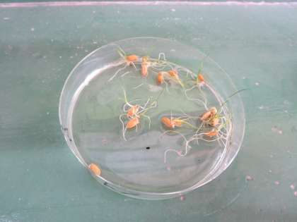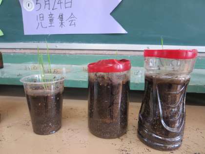 稲を水につけて数日間おいておくと発芽したので、ペットボトルに植えかえました。