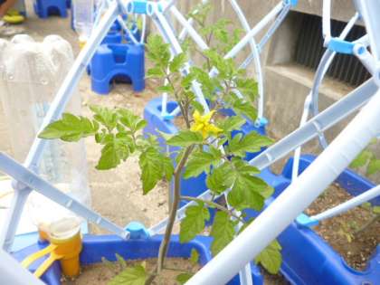 ミニトマトの成長を観察しています。見るたびに葉の数が増えていたり、くきがのびていたりと成長が見えます。中には花が咲いている子もいました。人と同じように成長に差があるので、子どもたちは自分のミニトマトに花が咲くのを心待ちにしている様子です。