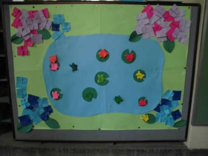 今日は、6月の掲示物を作成しました。作成後は、折り紙で作ったカエルを、池のハスの葉まで飛ばして遊びました。遊んだ後は、ハスの葉とカエルを貼り付けて、ひまわり学級の前に掲示しました。