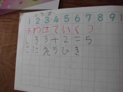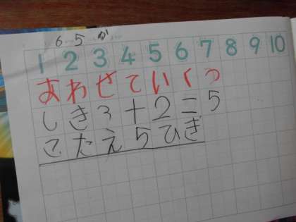 今日は「3+2」の学習で、ノートに「式」「答え」を書きました。