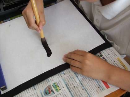 3、筆を持っていない方の手で、半紙を押さえる。