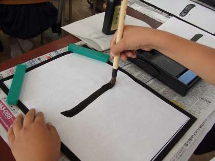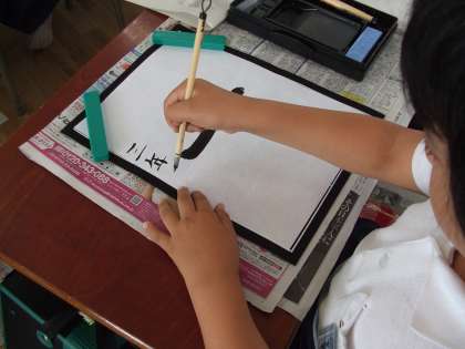 『一』っていう漢字は、鉛筆で何回も書いてきているけれど、筆で書くと、半紙の、どの部分から筆を入れて書くのか、どう筆を戻して『止める』のか・・・とっても難しかったね。