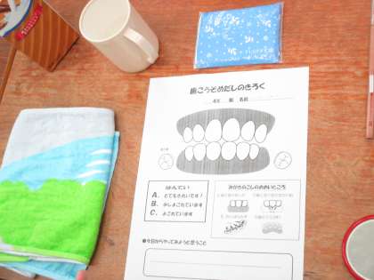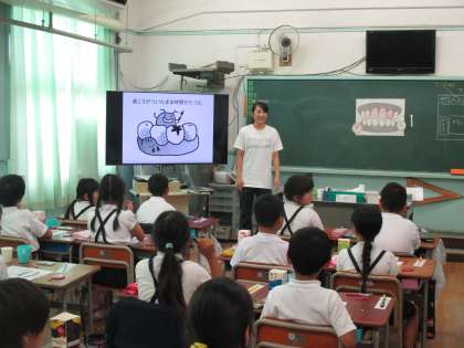 養護教諭の村上先生が分かりやすく丁寧に教えてくださいました。歯垢がたまりやすいところがよく分かったね。毎日のハミガキでしっかりよごれを落とそう!