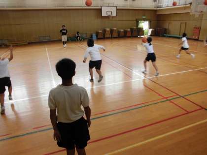 プロバスケットチーム 大阪エベッサの方がお越しいただき6年生にバスケットボールを教えていただきました。