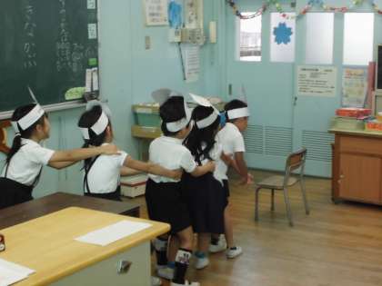 力を合わせて「かぶ」を抜こうとしている場面です。