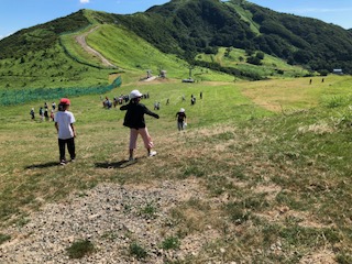 高原で走り回って遊んでいる子ども