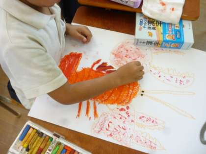 クラスで飼っているザリガニをよく見て、ザリガニの絵をかいています。描いたザリガニは、はさみで切って、別の画用紙に貼ります。