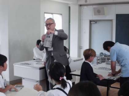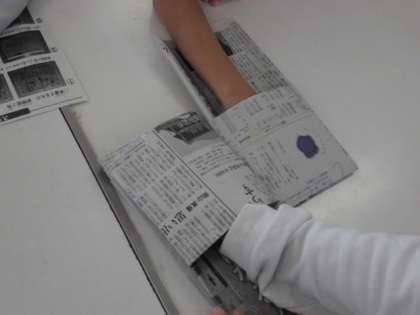 新聞紙を使っての簡易スリッパづくりです。素足では危ないときに役立ちます。