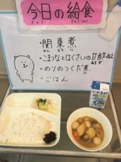 今日の給食は、関東煮 こまつなとはくさいの甘酢あえ のりのつくだ煮 米飯 牛乳です。