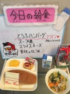 今日の給食は、とうふハンバーグ スープ煮 スライスチーズ パン 牛乳です。