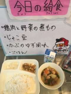 今日の給食は、鶏肉と野菜の煮もの じゃこ豆 かぶのゆず風味 米飯 牛乳です。