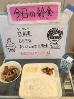 今日の給食は、筑前煮 ひじき豆 だいこんのゆず風味 米飯 牛乳です。