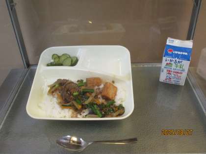 マーボあつあげ丼は辛味があり、あつあげとナスがたくさん入っていました。キュウリの中華和えはシャキシャキしており、米酢であっさりしていました。ぶどうゼリーはぶどうのすっきりとした甘みがありました。