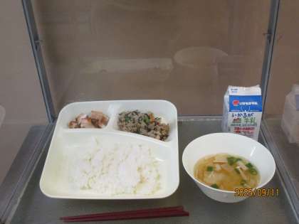 Today's school lunch featured salmon with a soy sauce glaze. The rich flavor of the salmon was complemented by the savory saltiness of the soy sauce.