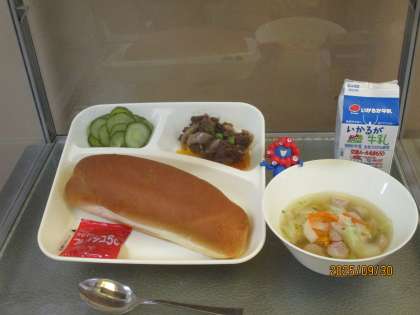 牛肉のデミクラスソース煮はコショウの風味が効いていて、甘酸っぱいデミクラスソースがパンとあっていました。ウインナーのスープはスープのうま味があり、野菜もたくさん入っていました。キュウリのピクルスはシャキシャキで酸味があり、あっさりとした味になっていました。