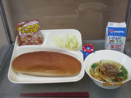黒糖パン、牛乳、タンタンメン、キャベツの甘酢漬け、おさつチップス