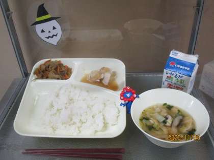 ご飯、牛乳、鶏肉のおろし醤油掛け、薄くず汁、きんぴらごぼう