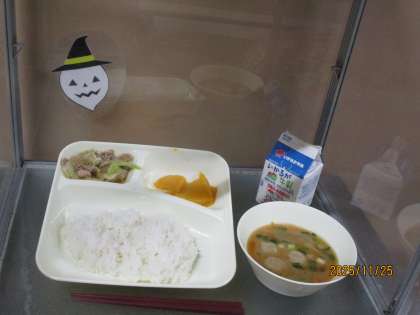ご飯、牛乳、豚肉と野菜の炒め物、イワシのつみれ汁、かぼちゃういろう