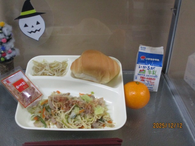 ミニコッペパン、牛乳、和風焼きそば、もやしのしょうがづけ、みかん