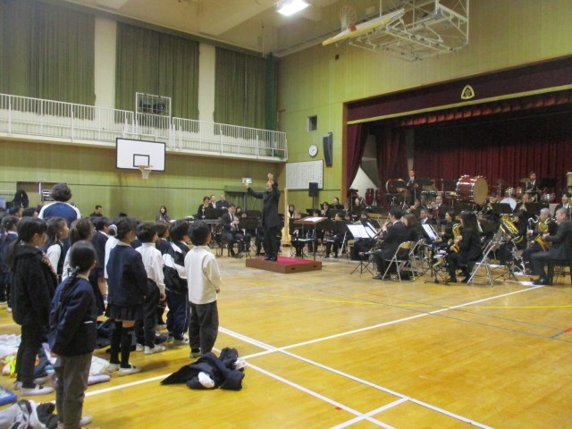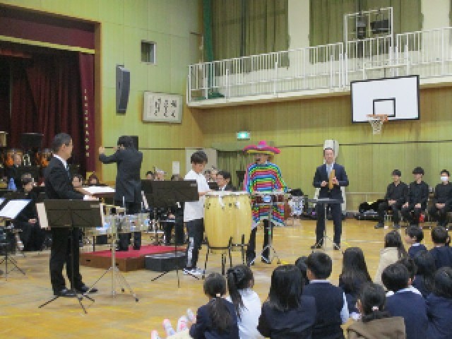 12月10日は文化庁の舞台芸術等総合支援事業としての学校巡回公演で、東京から国内トップクラスのプロの吹奏楽団である「シエナ・ウインド・オーケストラ」が演奏しに来てくださいました。総勢50人近い演奏者の方の迫力あるすばらしい演奏を目の前で聞かせていただき、子どもも大人も豊かな時間を過ごすことができました。万博の年にふさわしい「吹奏楽で巡る世界の音楽」を楽しみました。また、後半のプログラムでは、代表児童と教員が叩くコンガとともに手拍子をしたり、ワークショップで練習した「ビリーブ」を生演奏の伴奏で歌ったりして全校児童がオーケストラの演奏に参加し、貴重な体験ができました。