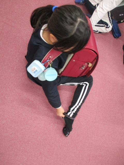 ランドセルを前に背負って妊婦さん体験をしました。